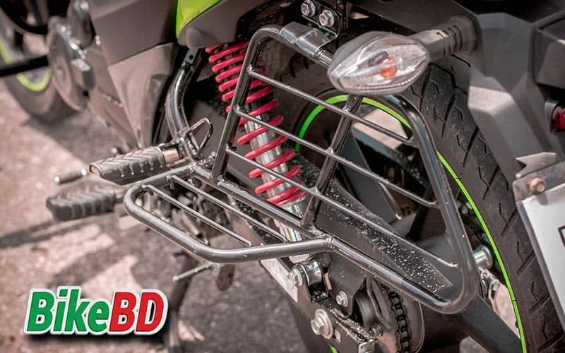 What will most attract you about this particular bike is the colour, they added green and then some sparkle glitters, am still to test a bike which has such an unique colour & it isn’t just for show, the colour quality is good too. They gave the bike double horn grab-rail on the rear for the pillion rider to seat comfortably, they added exhaust heat muffler & mudguards which are designed matched with it’s sporty profile.