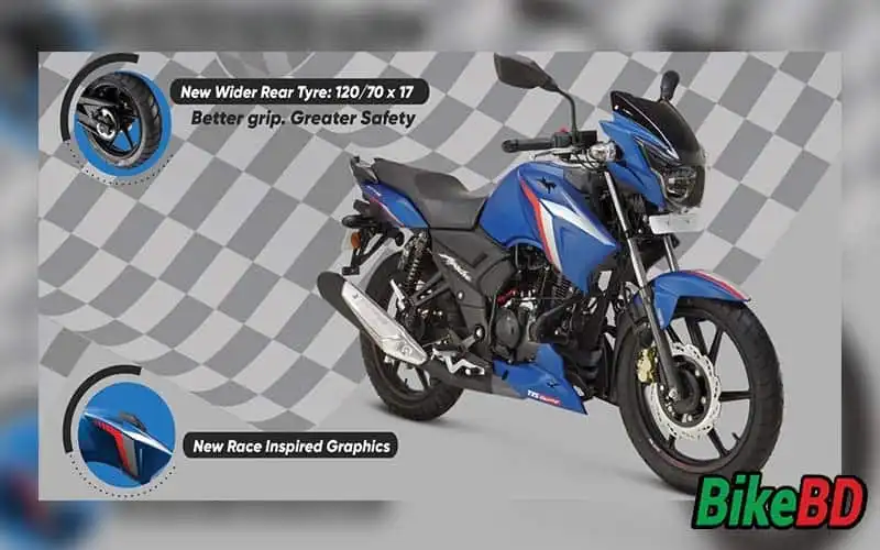 After months of testing in Bangladeshi condition upon complain from many bikers TVS installed a new 120 section rear wider tyre compare to the old variants having 110 sections wider tyre. TVS believe that with a wider tyre it will hep the bike to have better rear wheel grip which will help for high speed stability.