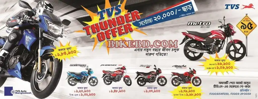 TVS Auto Bangladesh Ltd is giving away TVS Thunder Offer where they are giving away cash discount offer on TVS Motorcycles, this is the updated TVS Motorcycle Price In Bangladesh 2017, through a mail they confirmed us that the Thunder Offer will start from 15th January 2017 and will last for a very short period of time (Source).