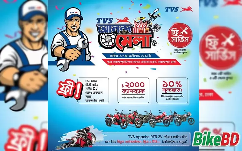 ২২ থেকে ২৪ অক্টোবর ঢাকার মোহাম্মদপুরের ঈদগাহ ময়দানে ৩ দিন ব্যাপী অনুষ্ঠিতব্য ̈ এই মেগা ইভেন্টে টিভিএস গ্রাহকদের জন্য ছিল ̈ ফ্রি সার্ভিসের পাশাপাশি ফ্রি সার্ভিসের কুপন, সেলস কুপন, স্পেয়ার পার্টসে ছাড়, রেফারেল বোনাস, ক্যাশব্যাক, বিশেষ মূল্যে টিভিএস বাইক, বাইক এক্সচেঞ্জের সুবিধা, বাইক লোনের সুবিধা, টেস্ট রাইড, ফ্রি স্ন্যাক্স , ফ্রি গিফট, ফ্রি হেলথ চেকআপ সহ আরো অনেক কিছু।