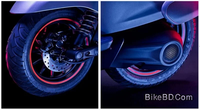 In the suspension system, the new Electric Chetak holds trailing linked suspension in the front. It’s a single-unit spring-loaded sealed hydraulic setup. At the rear it also single and also spring loaded-lead type that attached with the single-arm swing. Hence, the Chetak seized the Bajaj’s classic scooter suspension setup matching with trendy features.
